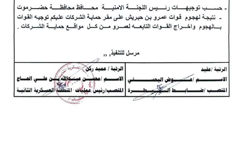 أصدر محافظ حضرموت، رئيس اللجنة الأمنية، توجيهات عاجلة إلى قيادة المنطقة العسكرية الثانية، تقضي بالتحرك الفوري لإخراج القوات التابعة لعمرو بن حبريش من مواقع حماية الشركات، وذلك عقب الهجوم الذي شنّته تلك القوات على مقر حماية الشركات.