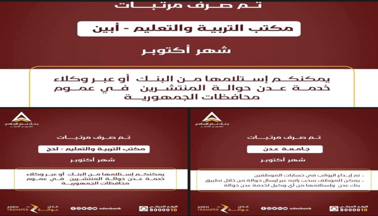 أعلن بنك عدن للتمويل الأصغر، اليوم الخميس، بدء عملية صرف مرتبات شهر أكتوبر 2024م، لموظفي مكتب التربية والتعليم في محافظتي أبين ولحج.