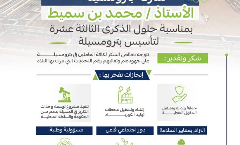 بمناسبة حلول الذكرى الثالثة عشرة لتأسيس شركة بترومسيلة، أشاد الأستاذ محمد بن سميط، المدير العام التنفيذي للشركة، بجهود كافة العاملين في مختلف القطاعات والمنشآت التابعة لبترومسيلة، مثمناً تفانيهم الكبير في أداء مهامهم رغم التحديات والظروف الصعبة التي شهدتها البلاد خلال الأعوام الماضية.