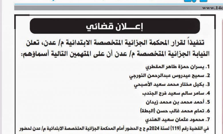 تنفيذا لقرار المحكمة الجزائية المتخصصة الابتدائية م/ عدن تعلن النيابة الجزائية المتخصصة م/ عدن أن على المتهمين التالية أسماؤهم: