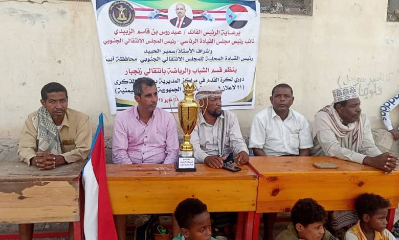 اختتم قسم الشباب والرياضة بالهيئة التنفيذية للقيادة المحلية للمجلس الانتقالي الجنوبي في مديرية زنجبار بمحافظة أبين، اليوم السبت، فعاليات دوري كرة القدم السباعية لفرق مراكز المديرية، الذي استمر على مدار ثلاثة أيام، وذلك بمناسبة الذكرى الـ31 لفك الارتباط.