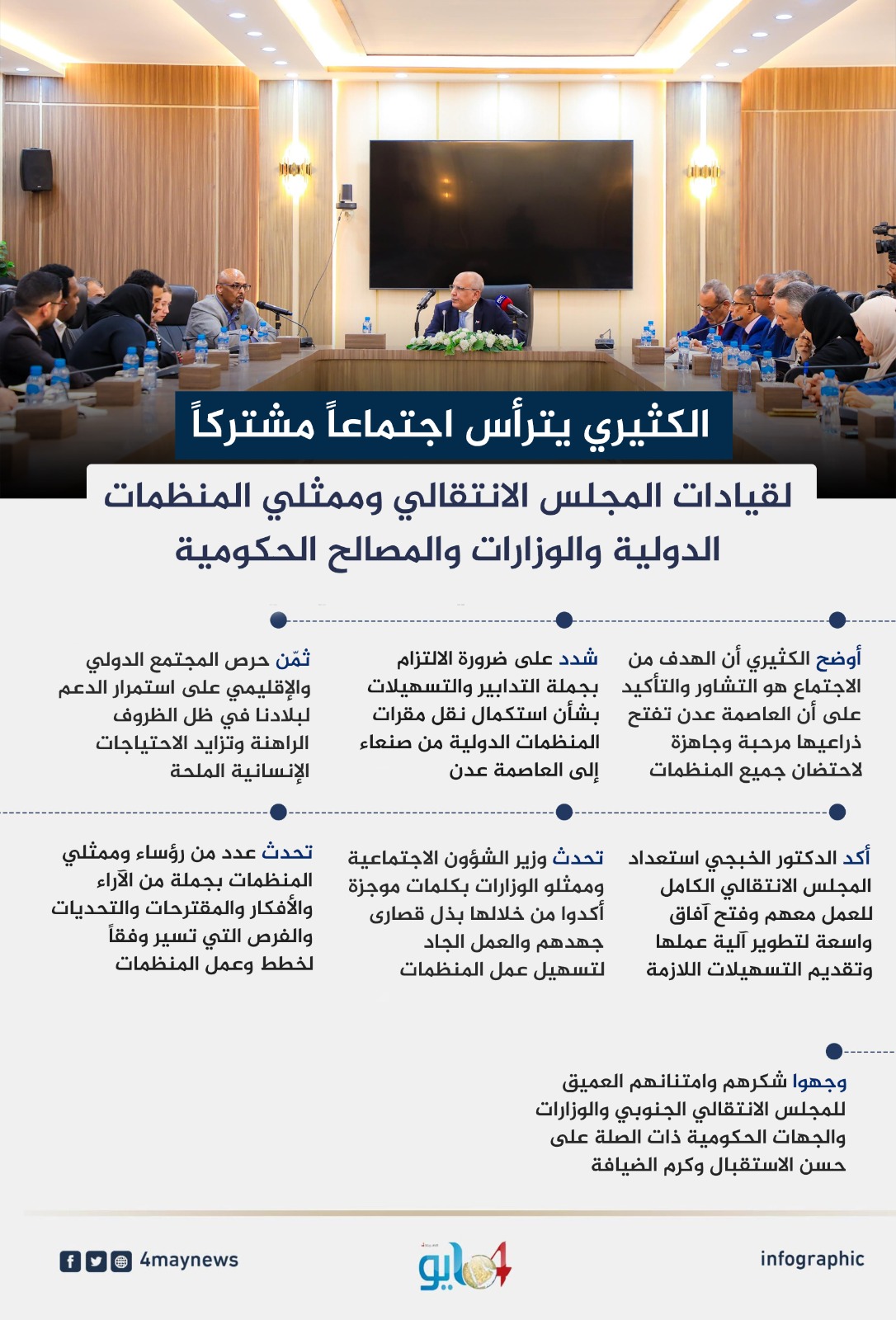 #إنفوجرافيك : الكثيري يترأس اجتماعاً مشتركاً لقيادات المجلس الانتقالي وممثلي المنظمات الدولية والوزارات والمصالح الحكومية