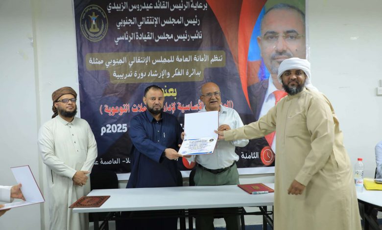 اختتمت دائرة الفكر والإرشاد في الأمانة العامة لهيئة رئاسة المجلس الانتقالي الجنوبي، اليوم الخميس، دورة تدريبية عن المهارات الأساسية لإدارة الحملات التوعوية، استمرت على مدى ثلاثة أيام متتالية.