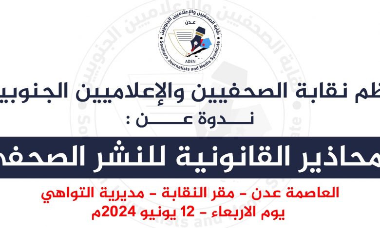 تنظم نقابة الصحفيين والإعلاميين الجنوبيين بالعاصمة عدن صباح يوم بعد غد (الأربعاء الموافق 12 يونيو 2024م)، ندوة موسومة بعنوان (المحاذير القانونية للنشر الصحفي).