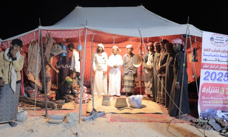 تواصل الخيمة التراثية في مهرجان “شباب الغد” بمنطقة أثوب فعالياتها المتنوعة، حيث تقدم فقرات غنية بالموروث الشعبي لمحافظة المهرة، مجسدة بذلك أصالة وتاريخ القبائل في المنطقة.