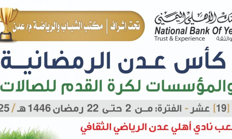 جرت صباح اليوم وقائع قرعة منافسات بطولة كأس عدن الخماسية للشركات والمؤسسات بنسختها التاسعة عشرة، بدعم وتمويل البنك الأهلي بعدن وتنظيم إتحاد الكرة وتحت إشراف مكتب الشباب والرياضة، وتستضيف مبارياتها أرضية ملعب الفقيد العلواني بالمنصورة ابتداءً من ثاني رمضان المبارك.