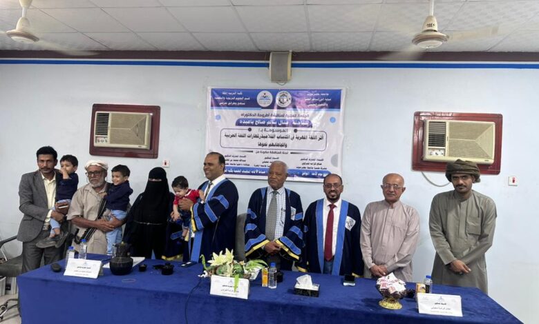 ناقشت صباح اليوم بجامعة حضرموت نيابة الدراسات العليا والبحث العلمي الجلسة العلنية لمناقشة الأطروحة لرسالة الدكتوراه الموسومة بـ بأثر اللغة المهرية في اكتساب التلاميذ لمهارات اللغة العربية واتجاهاتهم نحوها ، والمقدمة من الباحثة منال سالم صالح باعبده بكلية التربية بالمكلا.