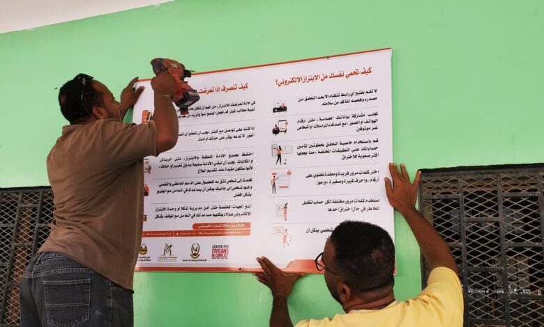 نفذت مؤسسة سلام وبناء مشروع تشييد وتركيب لوحات إرشادية توضح الخطوات التي يجب على الضحايا اتباعها عند تعرضهم للابتزاز الإلكتروني، لتعزيز الوعي حول كيفية التعامل مع حالات الابتزاز الإلكتروني، ضمن مخرجات مشروع رفع قدرات وحدة مكافحة الابتزاز الإلكتروني في مديرية أمن المكلا، بتمويل من منظمة سيفيك.
