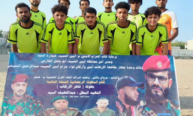 برعاية القائد العميد حيدرة السيد قائد الحزام الامني أبين و العميد أبو مشعل الكازمي مدير آمن أبين والداعم الرئيسي للبطولة العميد عبدالرحمن الشنيني قائد اركان الحزام الامني ورئيس جهاز مكافحة الارهاب بمحافظة أبين و القائد أحمد العسيري قائد مكافحة المخدراة ، والشاب مروان باقس مدير عام صندوق النظافة أبين ، وقائد مكافحة المخدراة القائد أحمد العسيري ، وإشراف إتحاد الفرق الشعبية بمديرية خنفر ، وبمشاركة 24 فريقيا” شعبيا” من مدينة جعار عاصمة مديرية خنفر قسمة إلى ثمان مجموعات يتأهل الأول والثاني من كل مجموعة.