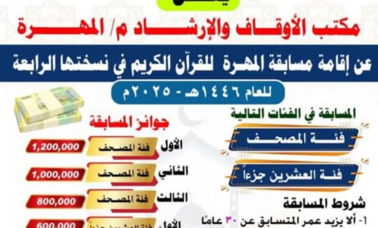 أعلن مكتب الأوقاف والإرشاد بالمهرة عن إقامة مسابقة المهرة للقرآن الكريم في نسختها الرابعة