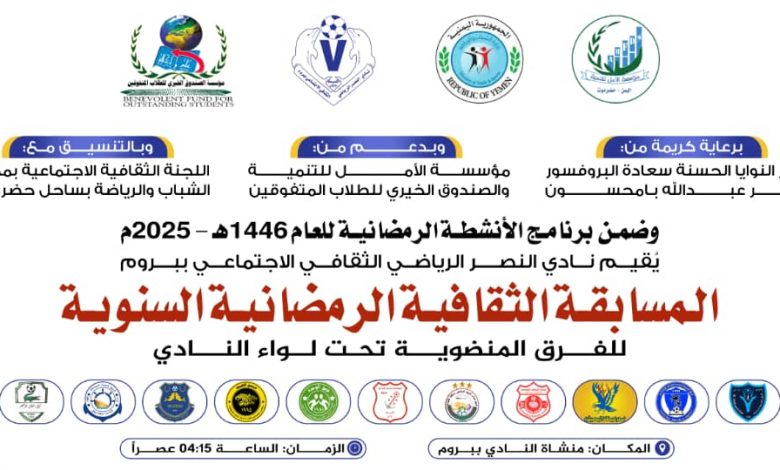 تنطلق عصر يوم غد الجمعة، بمنشأة نادي النصر الرياضي الثقافي الاجتماعي ببروم، اولى فعاليات الأنشطة الرمضانية، بتنظيم المسابقة الثقافية والفكرية الرمضانية السنوية بين متسابقين يمثلون 11 فريقا رياضيا منضويا تحت لواء النادي، بالتنسيق مع اللجنة الثقافية والاجتماعية بمكتب الشباب والرياضة بساحل حضرموت.