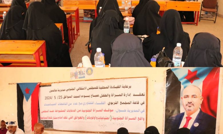 هذا وقد جرى خلال اللقاء مناقشة المقترحات والأفكار التي تخص المرأة وسبل تعزيز دورها الريادي لنشر الوعي الثقافي والسياسي في المجتمع لمواجهة التحديات التي تواجه العمل السياسي وكيفية التعامل مع من يحاول استهداف القضية الجنوبية والوقوف أمام الأساليب الممنهجة من بعض القوى المعادية للمجلس الانتقالي الجنوبي الحامل للقضية الجنوبية والممثل الوحيد لشعب الجنوب وعرقلة مساعي القيادة السياسية نحو الحرية والاستقلال واستعادة الدولة الجنوبية.