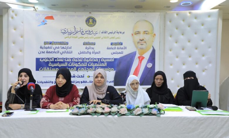 نظّمت دائرة المرأة والطفل في الأمانة العامة لهيئة رئاسة المجلس الانتقالي الجنوبي، مساء اليوم الأحد، بالعاصمة عدن، أمسية رمضانية بعنوان “حب الوطن يجمعنا.. فهو رمز للهوية والتاريخ والتضحيات”، لعدد من الشخصيات النسائية السياسية والناشطات في المجتمع المدني والمستقلات.