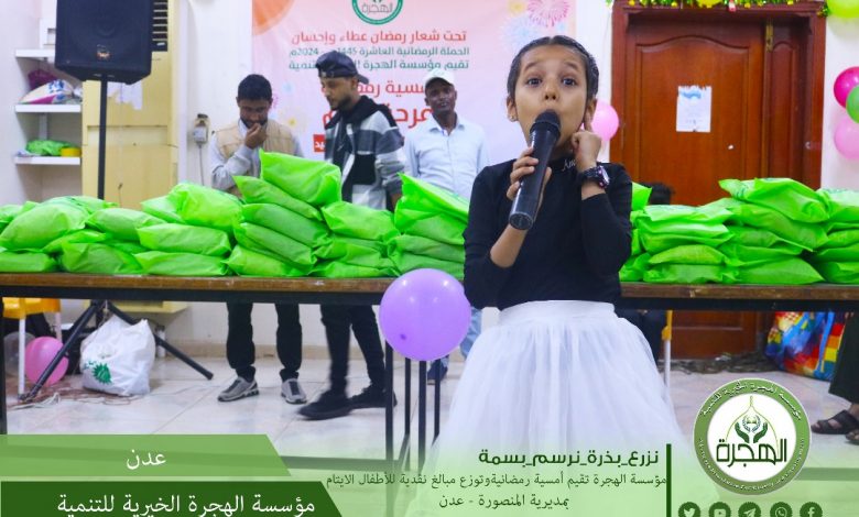 تواصلاً لأعمال الحملة الرمضانية العاشرة ، أقامت مؤسسة الهجرة الخيرية للتنمية بمديرية المنصورة أمسية رمضانية فرائحية للأطفال الأيتام ، وذلك بهدف إدخال الفرحة والبهجة على قلوبهم .