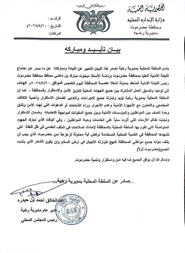 بيان تأييد ومباركة صادر عن السلطة المحلية بمديرية ساه لمضامين بيان اللجنة الأمنية العليا بحضرموت