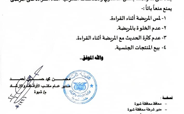مكتب أوقاف شبوة ينشر تعميماً خاصاً بمراكز العلاج بالقرآن الكريم