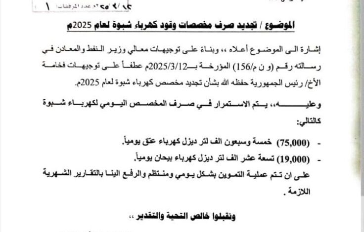 وقال الرفاعي في منشور عبر حسابه الرسمي على “فيسبوك”، إن كهرباء شبوة تواجه شحًا حادًا في إمدادات الوقود، رغم صدور توجيهات واضحة منذ مطلع مارس الماضي من معالي وزير النفط والمعادن، ومن المدير العام التنفيذي لشركة النفط اليمنية، تقضي بتوفير 75 ألف لتر ديزل لمحطة كهرباء عتق، و17,500 لتر ديزل لكهرباء بيحان، على أن يتم التموين بشكل يومي ومنتظم.