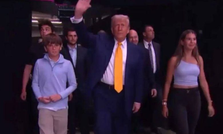 خلال دخوله، استقبل ترامب العديد من الحضور البارزين بما في ذلك مذيع UFC ومقدم البودكاست جو روجان ورئيس شركة Barstool Sports ديف بورتنوي.