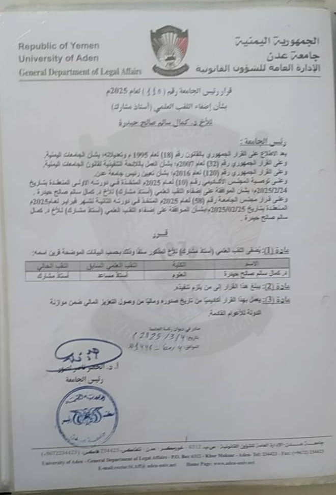 في خطوة تعكس تقدير جامعة عدن للكفاءات العلمية والأكاديمية، أصدر رئيس الجامعة قراراً بمنح الدكتور كمال سالم صالح حيدرة لقب “أستاذ مشارك”، وذلك نظير جهوده المتميزة وإسهاماته البارزة في المجال الأكاديمي والبحثي.
