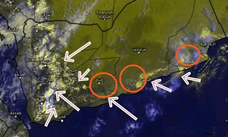 من المتوقع بإذن الله تعالى خلال الساعات القادمة، عودة تجدد نشاط الخلايا الرعدية على المرتفعات الغربية لبلادنا، مع توقعات نشاط رعدي واسع على هذه المناطق. كما يحتمل امتداد التأثيرات إلى بعض المرتفعات الجبليه الجنوبية والساحلية من المهرة، حضرموت، شبوة، وفرص جيدة على بعض مرتفعات غرب وجنوب مأرب ، أبين، لحج، الضالع، البيضاء، تعز . تزداد فرص هطول الأمطار في بعض هذه المناطق، مع إحتمالية ظهور خلايا رعدية . هذا والله أعلم