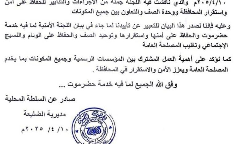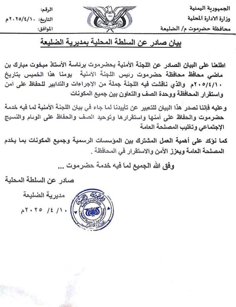 بيان تأييد صادر عن السلطة المحلية بمديرية الضليعة لبيان اللجنة الأمنية العليا بحضرموت