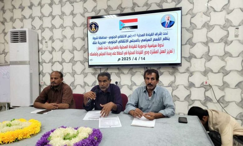 نظم القسم السياسي بالهيئة التنفيذية للقيادة المحلية للمجلس الانتقالي الجنوبي في مديرية عتق بمحافظة شبوة، اليوم الاثنين، ندوة سياسية توعوية لأعضاء القيادة المحلية بالمديرية، تحت شعار “تعزيز العمل المشترك ودور القيادة المحلية في الحفاظ على وحدة المجلس وتماسكه”.