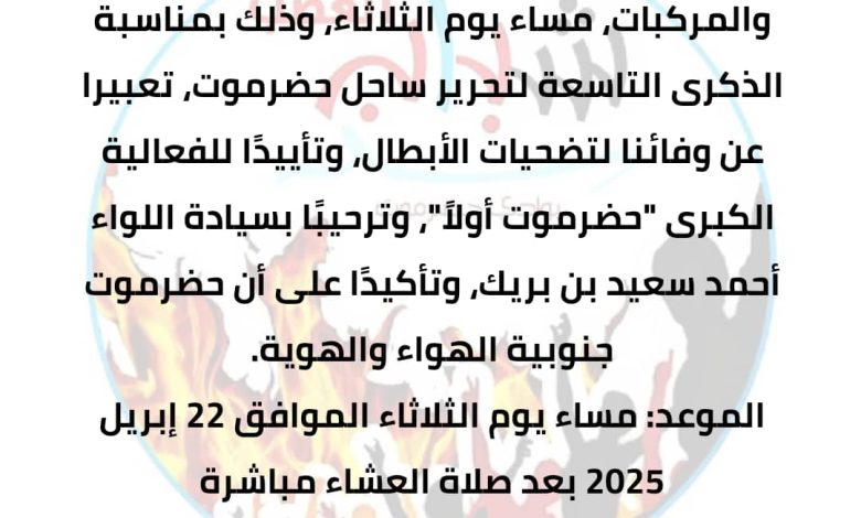 نهيب بجميع أبناء وادي وصحراء حضرموت وكافة الشرائح الاجتماعية المشاركة الفاعلة لإنجاح المسيرة السلمية، ولنرفع الصوت عاليا: حضرموت لن تُختطف… حضرموت جنوبية الهوى والهوية.
