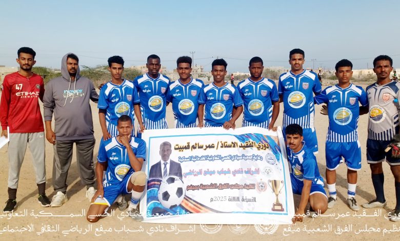 بلغ عصر اليوم السبت فريق النهضة الرياضي بعزان محافظة شبوة لدور نصف النهائي بعد فوزه على نظيره فريق المستقبل حجر بركلات الترجيح بعد التعادل الإيجابي هدف لهدف في الوقت الأصلي للمباراة، ضمن منافسات دور ربع النهائي لدوري الفقيد عمر سالم قمبيت، الذي يأتي برعاية جمعية صيادي الحسي التعاونية السمكية بميفع، وإشراف نادي شباب ميفع الرياضي، وتنظيم مجلس الفرق الشعبية بميفع احتضنها ملعب تمارين نادي شباب ميفع الرياضي “الجسر ” بمدينة ميفع الرياضية.