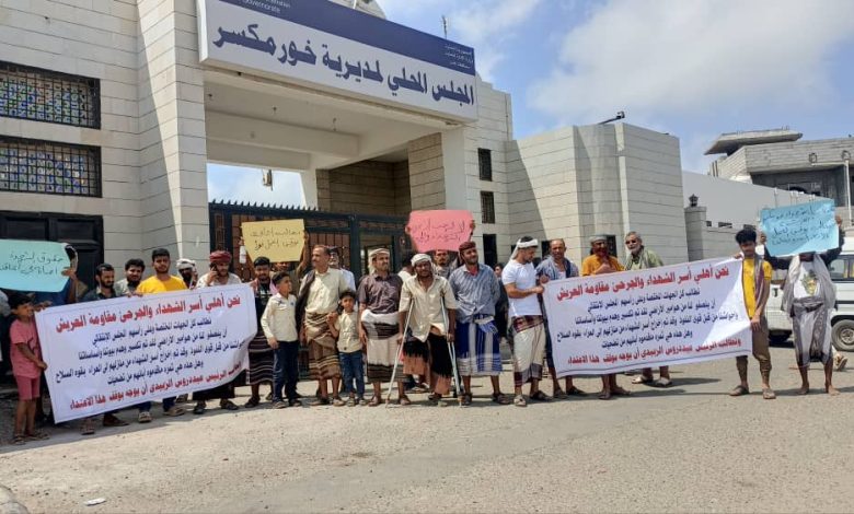 أسر شهداء منطقة العريش ينظمون وقفة احتجاجية أمام المجلس المحلي بخور مكسر