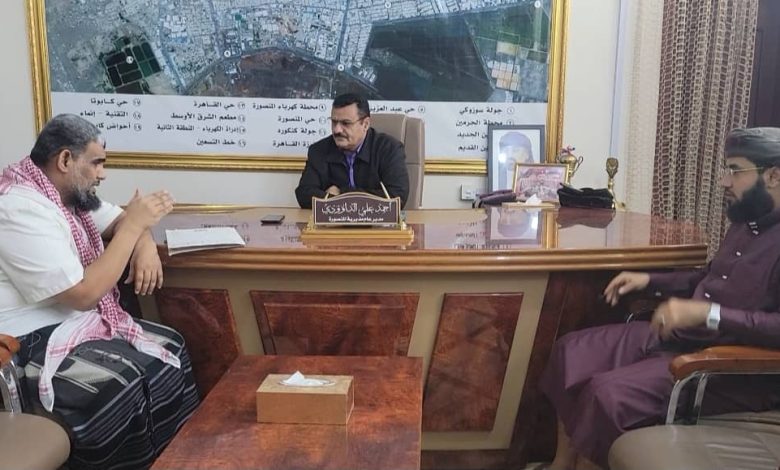 جاء ذلك، خلال لقائه في مكتبه بديوان عام السلطة المحلية في المديرية، بمدير عام مكتب الأوقاف والإرشاد بعدن، الدكتور محمد حسين الوالي، لمناقشة أوضاع المساجد، والوقف والإرشاد الديني في مديرية المنصورة.