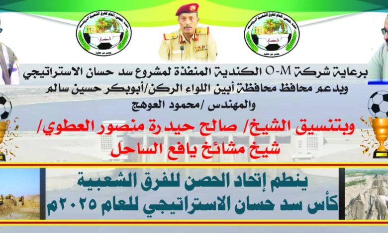 *البطولة ستقام برعاية شركة (O-M) الكندية المنفذة لمشروع سد حسان الاستراتيجي ، وبدعم محافظ محافظة أبين اللواء الركن/أبو بكر حسين سالم ، و المهندس/محمود العوهج ، وبتنسيق الشيخ صالح حيدرة منصور العطوي /شيخ مشائخ يافع الساحل ، وتنظيم إتحاد الحصن للفرق الشعبية*
