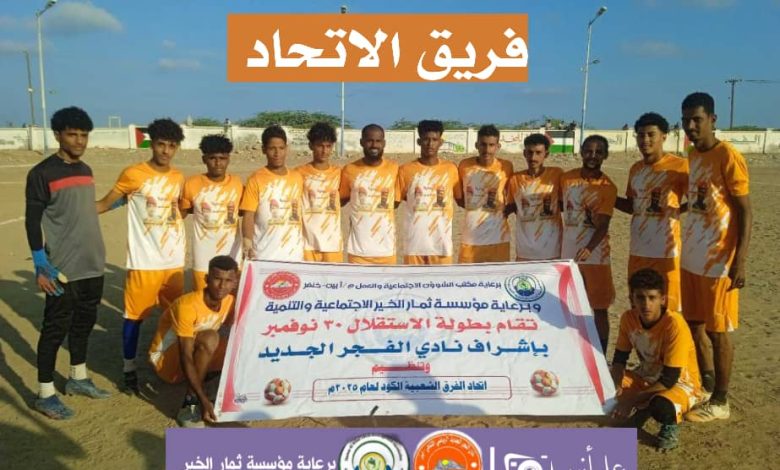 قاد المدافع المخضرم يسلم جويل فريقه الاتحاد لفوز ثمين أمام جاره فريق العين بهدف نظيف في دوري 30نوفمبر عيد الاستقلال للفرق الشعبيه بالكود الذي ينظم برعاية مكتب الشوؤن الاجتماعية والعمل محافظة أبين وبرعاية مؤسسة ثمار الخير الاجتماعية والتنموية وبإشراف إدارة نادي الفجر الجديد وتنظيم إتحاد الفرق الشعبية بالكود خنفر