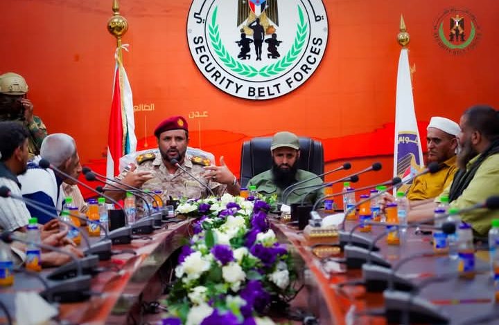 التقى العميد محسن الوالي، القائد العام لقوات الحزام الأمني، والعميد نبيل المشوشي، أركان ألوية الدعم والإسناد وقائد اللواء الثالث، بعدد من مشايخ وأعيان وشخصيات اجتماعية من أبناء مديرية مودية بمحافظة أبين، وذلك في العاصمة عدن، لمناقشة الأوضاع الأمنية والتحديات المرتبطة بمكافحة الإرهاب،بحضور الشيخ جمال العاقل، والشيخ صالح المجعلي والعميد لؤي الزامكي، قائد اللواء الثالث حماية رئاسية.