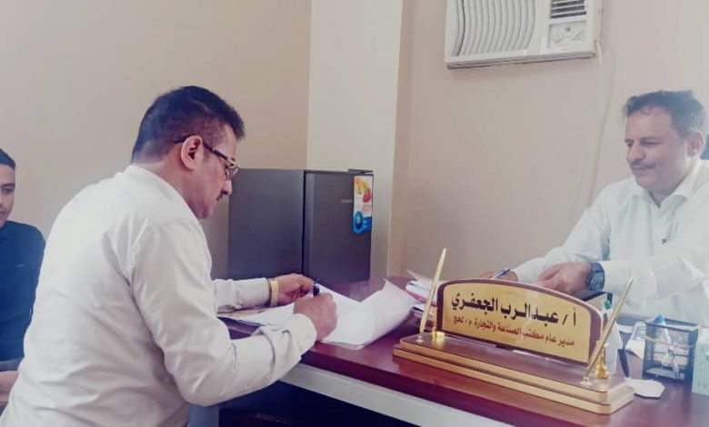 حيث وقع بمكتب الصناعة والتجارة بالمحافظة على التقارير النهائية ونتائج عمل اللجنة المكلفة برئاسة مدير المكتب العام الإستاذ عبد الرب الجعفري وعضوية كل من هيئة الأراضي النائب المهندس فهد عبد العزيز وهيئة الإستثمار الاستاذ علاء ابراهيم والأشغال م. عبد الكريم الصبيحي والخدمة المدنية الإستاذ محمد صلاح المدس والشؤون القانونية بالديوان المحافظة المحامي جلال طمبح الذين انجزوا العمل ورفعاها لمحافظ لحج لبحث الحلول والمعالجات وإتخاذ الإجراءات المتبعة والبداء العمل في إنشاء المصنع مع المستثمرين الذين تقدموا لإنجازه ..