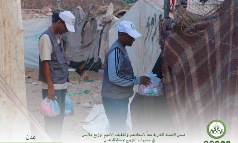 مؤسسة الهجرة توزع ملابس لأطفال النازحين في المخيمات بالعاصمة عدن