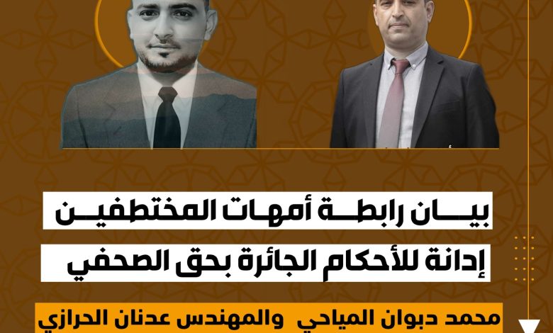 رابطة أمهات المختطفين تدين الأحكام الجائرة بحق الصحفي محمد المياحي والمهندس عدنان الحرازي