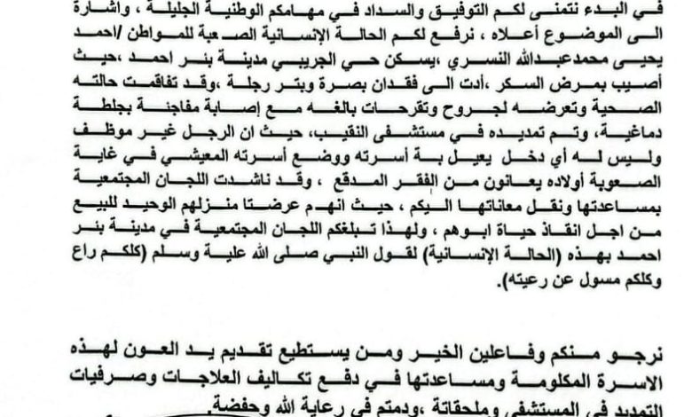 كما أكد مسؤول اللجان المجتمعية في المناشدة أن المريض بحاجة ماسة إلى استكمال مراحل علاجه في المستشفى ما يتطلب دعما ماليا لتغطية تكاليف العمليات والأدوية والمستلزمات الطبية الضرورية وهو ما لا تستطيع الأسرة تحمله