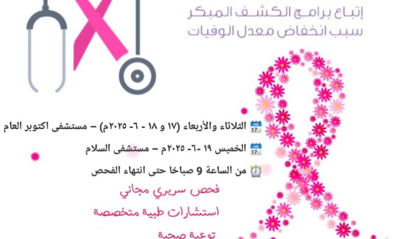 هذا وستكون أيام الفحص السريري المجاني للكشف المبكر عن سرطان الثدي على النحو التالي: