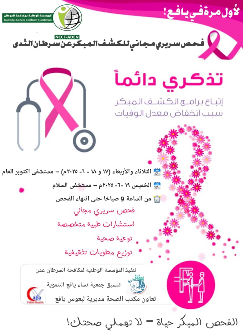 المؤسسة الوطنية لمكافحة السرطان تنظيم الأسبوع القادم مبادرة صحية وتوعوية للكشف المبكر عن سرطان الثدي في يافع لبعوس