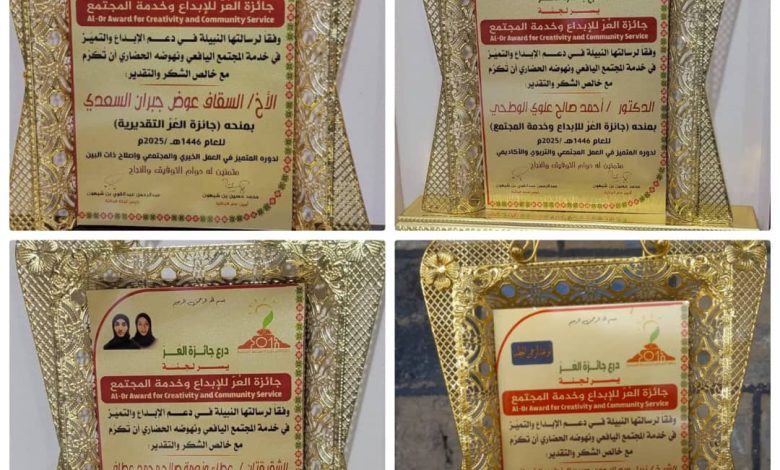 أعلنت لجنة جائزة العر السنوية للإبداع وخدمة المجتمع يومنا هذا الأحد 2025/6/15م عن خمس شخصيات مستحقة للجائزة لهذا العام 1446هـ/2025م حيث تم الإعلان عن المكرمين بهذه الجائزة في مهرجان التراث اليافعي في يومه الثالث في الموسطة والفائزين بالجائزة هم: