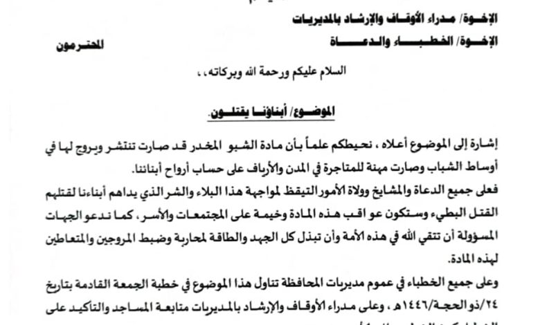 أوقاف شبوة تصدر تعميماً لتناول خطر الشبو المخدر في خطبة الجمعة القادمة وتدعو مكاتب أوقاف المديريات لمتابعة التزام كل المساجد