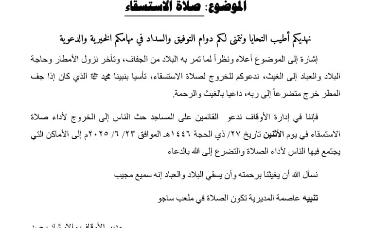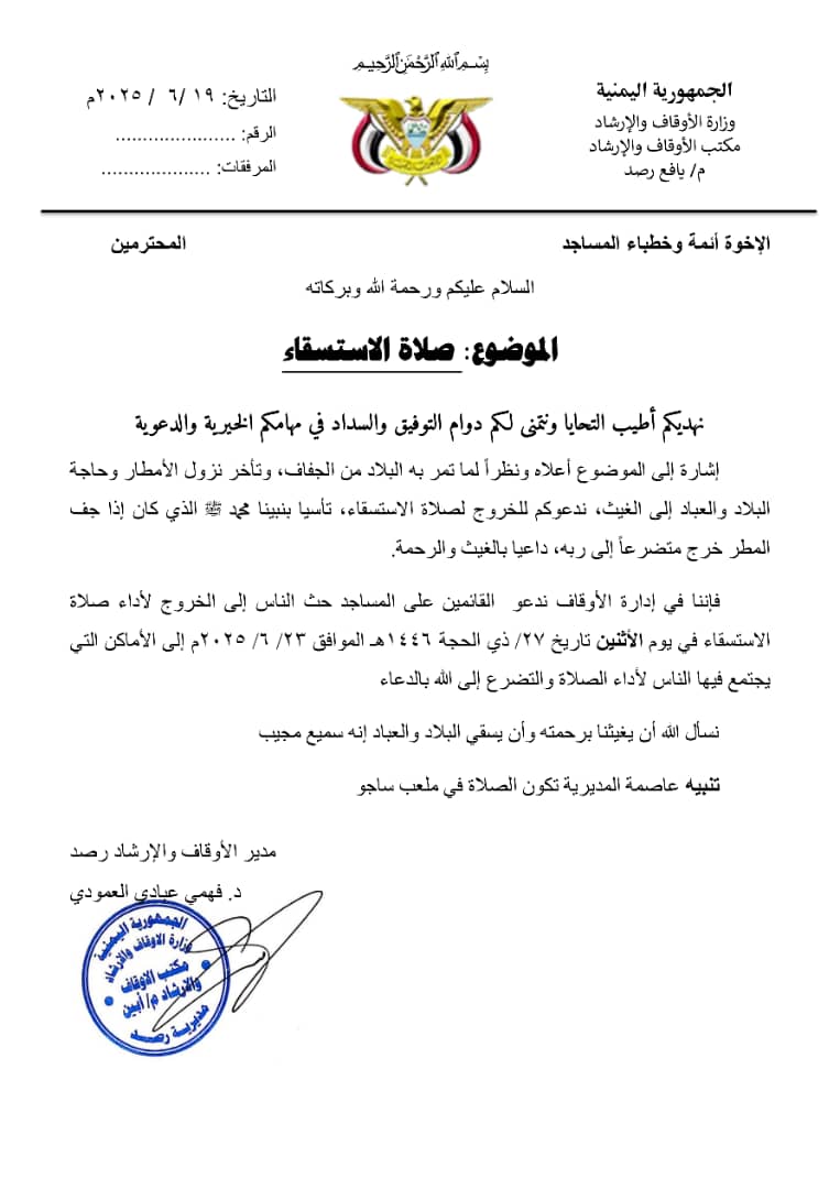 ناشد مدير مكتب الأوقاف والإرشاد في مديرية يافع رصد بمحافظة أبين الدكتور فهمي عبادي العمودي خطباء المساجد في عموم مناطق المديرية بحث الناس إلى الخروج لأداء صلاة الاستسقاء يوم الأثنين تاريخ 27 ذي الحجة 1446هـ الموافق 2025/6/23م نظراً لما تمر به البلاد من الجفاف وتأخر نزول الأمطار وحاجة البلاد والعباد إلى الغيث تأسيا بنبينا محمد صلى الله عليه وسلم الذي كان إذا تأخرت الأمطار وجفت الأبار واجدبت الأرض خرج متضراً إلى ربه داعياً بالغيث والرحمة.