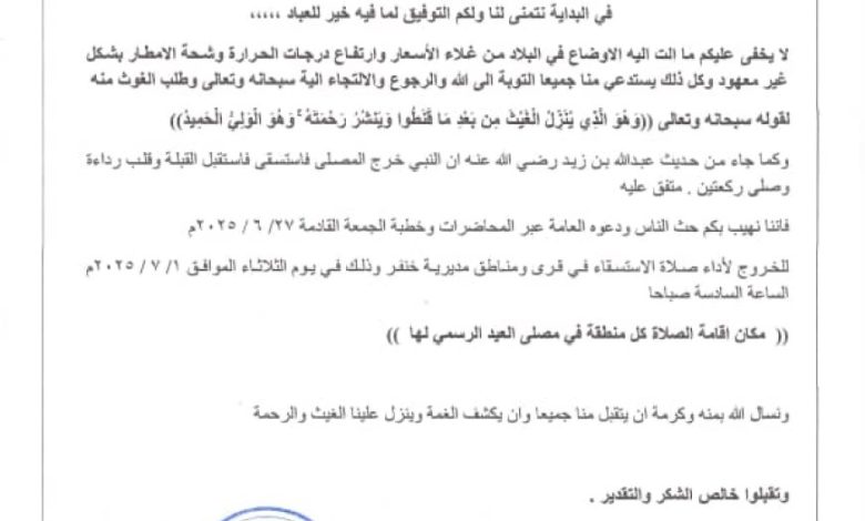 وفي بيان رسمي صادر عن المكتب، دعا مدير أوقاف خنفر، الشيخ فهد علي عبدالله، إلى اغتنام خطب الجمعة المقبلة الموافق 27 يونيو 2025، للدعوة إلى التوبة والرجوع إلى الله سبحانه وتعالى، وحث الناس على المشاركة في صلاة الاستسقاء المزمع إقامتها صباح الثلاثاء القادم الموافق 1 يوليو 2025 في تمام الساعة السادسة صباحاً.