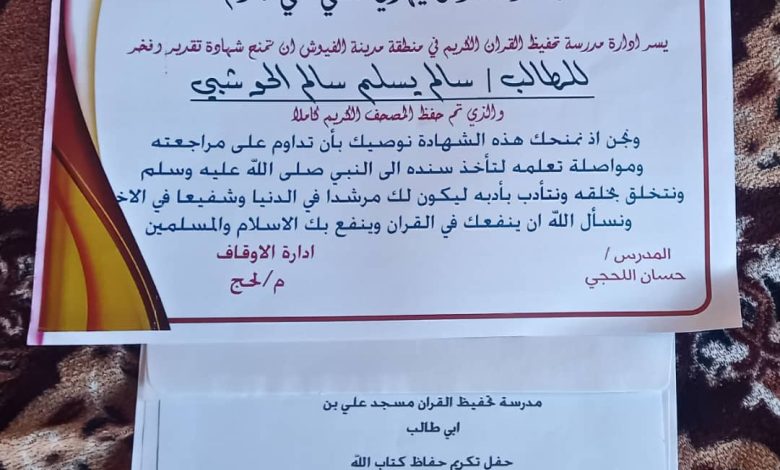 تهنئة للأخ سالم يسلم الحوشبي على شهادة حفظ القرآن الكريم
