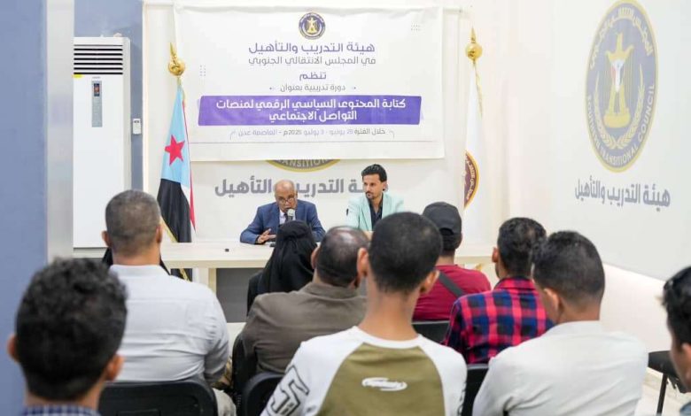 دشنت هيئة التدريب والتأهيل المساعدة لهيئة رئاسة المجلس الانتقالي الجنوبي، اليوم الأحد، دورة تدريبية في كتابة المحتوى السياسي الرقمي لمنصات التواصل الاجتماعي، تستهدف عددًا من كوادر المجلس العاملين في المجال الإعلامي والسياسي.