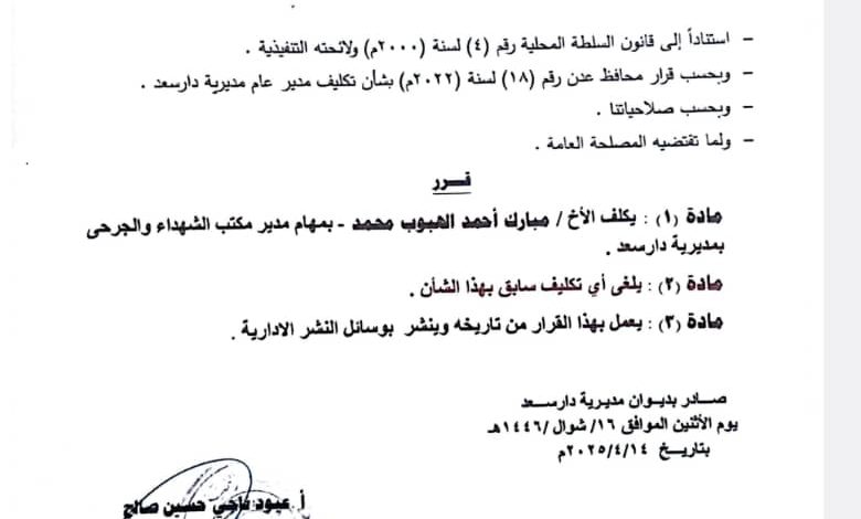 وجاء القرر رقم (( 1 )) لسنة 2025م، الصادر من قبل مدير عام مديرية دارسعد رئيس المجلس المحلي الاستاذ / عبود ناجي حسين، بشأن تكليف مدير مكتب الشهداء والجرحى م / دارسعد ، استنادا إلى قانون السلطة المحلية رقم ( 4 ) لسنة ( 20000 ) ولائحته التنفيذية، وبحسب قرار محافظ عدن رقم ( 18 ) لسنة ( 2022 )) بشأن تكليف مدير عام لمديرية دارسعد، وبحسب صلاحياته، ولما تقتضية المصلحة العامة .