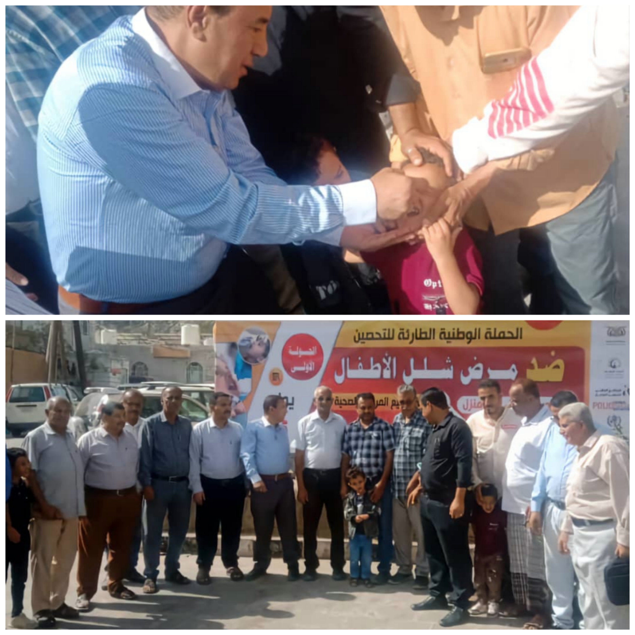 أثناء تدشينهما لحملة التحصين في مستشفى النصر المركزي بعاصمة المحافظة وبحضور عدد من المسؤولين بالمحافظة، أعطى رئيس المجلس المحلي ومدير عام مكتب الصحة قطرات من لقاح الشلل لبعض الأطفال إيذانًا ببدء وانطلاق الحملة.