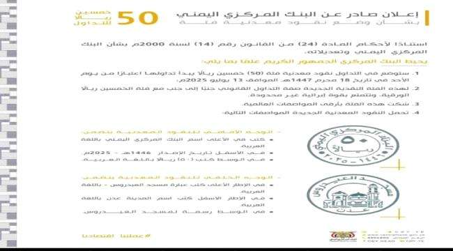 1/صك العملة اختصاص حصري للبنك المركزي في العاصمة عدن.