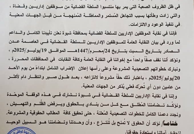 وأعلنت النقابة، تأييدها الكامل لما ورد في بيان النقابة العامة للموظفين الإداريين للسلطة القضائية في العاصمة عدن، والذي دعا إلى إضراب شامل بدءًا من يوم الأحد 20 يوليو 2025م، كخطوة مشروعة لانتزاع الحقوق بعد عامين من الانتظار والصبر.