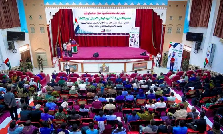 تقديراً وعرفاناً للدور الكبير لدولة الإمارات العربية المتحدة الشقيقة، ولما قدمته من دعم ومساندة في مختلف المجالات لمحافظة شبوة بوجه خاص واليمن بشكل عام، أقيم صباح اليوم بمركز يسلم بن علي الثقافي بمدينة عتق حفل فني وخطابي بمناسبة العيد الثالث والخمسين لإعلان اتحاد الإمارات العربية المتحدة.